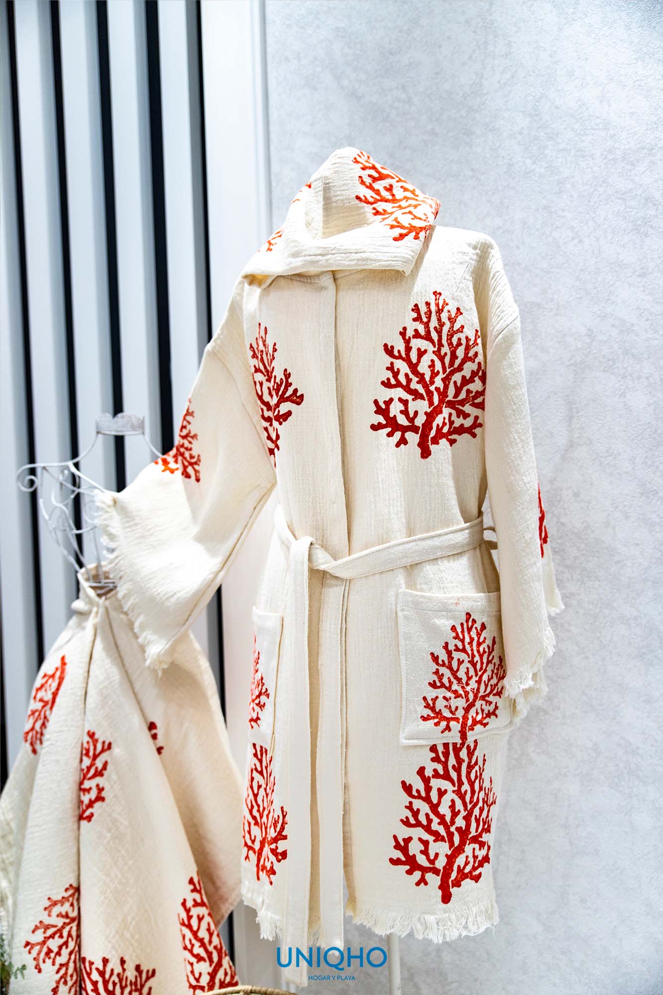 Kimono, Bathrobe, Woodblock Print, Coral, Red